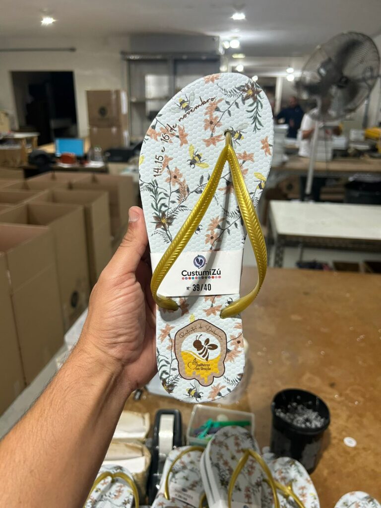 Os chinelos personalizados ocupam o topo da lista — e não é à toa. Eles são funcionais, confortáveis, fotogênicos e inesquecíveis.